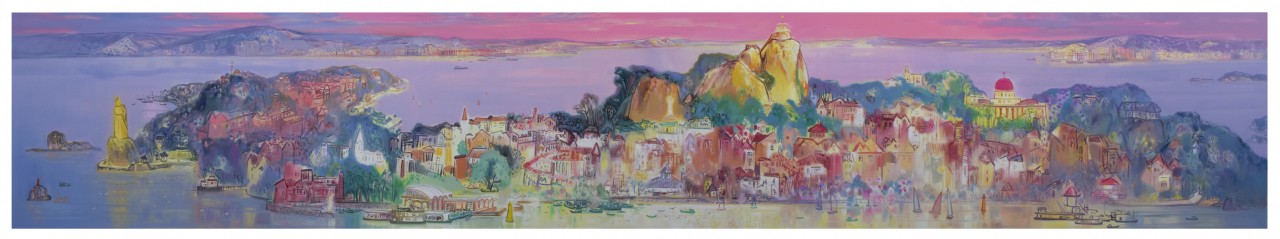 “站得远远地看,(鼓浪屿)就像一柄如意横卧在海中。”谈及自己新作的创想过程,张及时先生表示,2020年的疫情让他开始思考在画中添加祝福的意象。最容易让人一眼看见的要属画卷中间位置日光岩寺的观音像。背依着龙头山,观音菩萨散发着温柔的光晕。屹立在鼓浪屿东南端的覆鼎岩之上,被厦门人视为保护神的郑成功,也用了比较重的笔触勾勒突出。三一堂、天主堂、礼拜堂等鼓浪屿著名教堂的身影错落在建筑群中,都蕴含着画家祈祷一切安好的仁爱之心。植被簇拥环绕着日光岩,不同的绿色交互流淌着。尽管绿色不是张及时先生以往描绘鼓浪屿时的常用色,但在今年这个特殊的年份,他更希望用这一抹绿,带给观者平和的心情和健康的感觉。