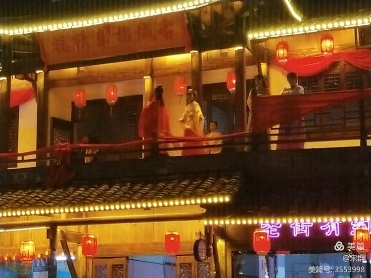 人流如织的古街,歌声叫卖声,吆喝声此起彼伏,时不时的,会随风送来一阵阵悠远空灵的古琴之音。一串串穿透力极强的红灯笼,在夜色的衬托下格外醒目,似乎比星光还要迷人。