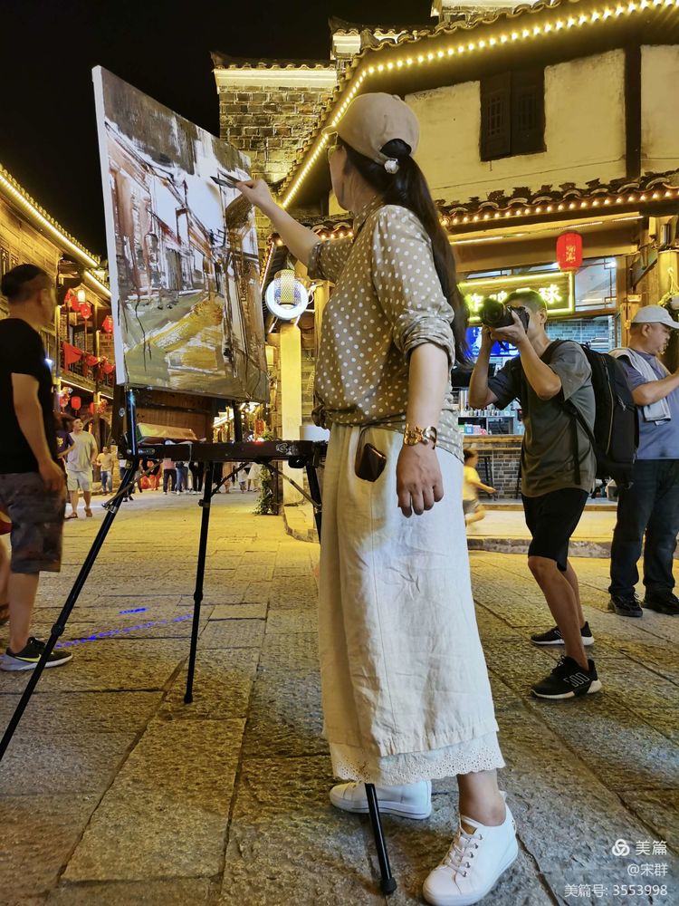古城的夜晚很明亮,我被月光溶溶下的风物所陶醉。我们几位初来古城的画家,在代山老师的建议下,第一回在夜色中写生,第一次各自用画笔表现了古城的夜景。当色彩在画布上流动,我已融入古城,随着骑楼的起伏变化,点线面的交织,建立着我心中的古城画面。