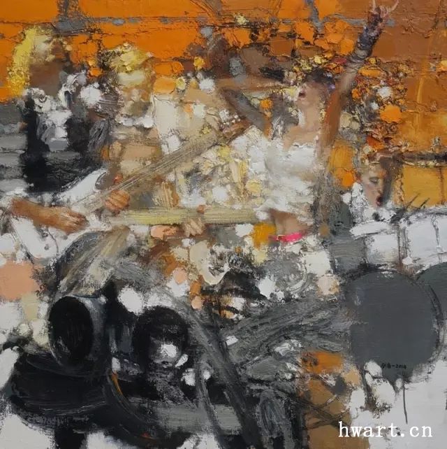 画画的过程是一种变化万千、生机勃勃的状态。绘画是在形象的直观中完成,越是画到弓扬弦舞之时,越觉得自已就在这些乐者中间,即我和他们在美好音乐的氛围中交流,同时又放飞自己的那种心绪,把生命体验融合其中。画面不再是简单的对客观物象世界的把握,它是多层次的交融,即一种生命的自由、质朴和单纯:心随乐舞。