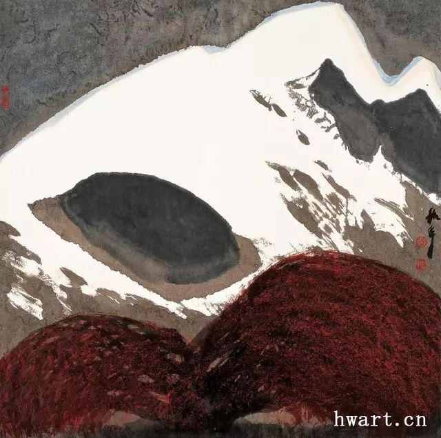 他之所以能够成为改革开放时期代表性水墨画家,是因为他在新的时代对以往的主流山水画在传承中又进行了大幅度的改革,这突出表现在他对现代性和现代转型的明确追求,为此他淡化了写实性强化了写意性,淡化了具象性强化了抽象性,淡化了叙事性强化了象征性,淡化了政治性强化了文化性。他不仅将大山大水视为江山社稷的象征,而且将其视为“独与天地精神往来”(庄子语)的载体;不仅礼赞山水的雄伟壮阔,而且以有力的结构、明快的色彩和大写意的笔法抒发胸中的浩然之气;不仅担当大时代精神,而且担当中华文化精神和大宇宙精神。对于这种正面弘扬超大灵魂,充满理想主义和英雄主义的美学追求,周韶华称之为“大美”。