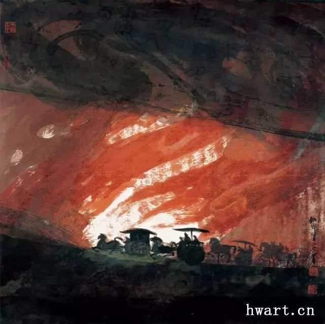 大部分“融合派”画家在回归传统的阶段也都跳出了文人书画传统和院体艺术传统,周韶华便是这种倾向积累到一定程度的产物。周韶华亦属“融合派”,他不同与其他“融合派”画家的独特性在于他不是从西画入手而是从中国大传统入手寻求中西融合,从而成了一个转折性人物。“以东方融汇西方”, 是周韶华的独特坐标。