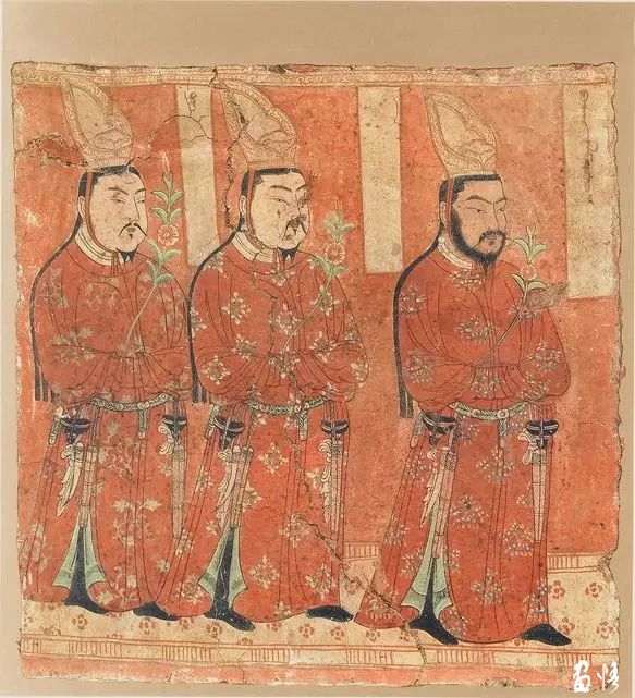 供养人面部方圆,头顶束冠,脑后垂发,一脸络腮胡,样貌稳重而坚毅。一手持花供养,周围还有红色的楼阁和帘幕作为背景。