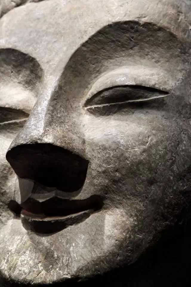 巨佛身体扁平,疏朗的衣纹线形成汇集趋势牵引视线,突出光润的脸部,身躯僵直平板,没有扭转动势,塑造显得羸弱,却反衬出方圆的脸庞和唇边微笑的盎然生机。微笑,这一微小的动势,像一颗石子,激起一排排围绕着它的衣褶弧线,涟漪般荡漾开来,搅动全场。