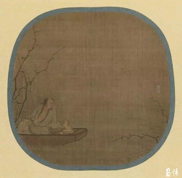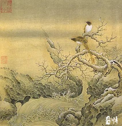 岸石上覆盖积雪,画家以水墨烘染阴天,